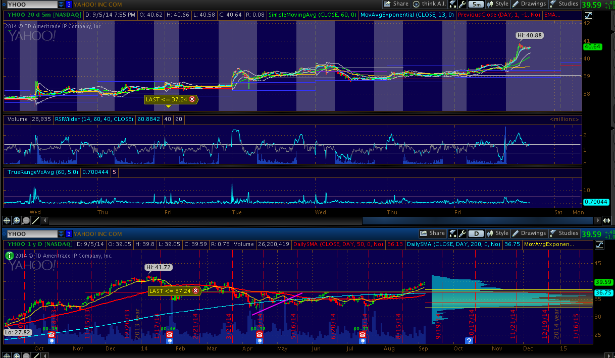 YHOO - things are heating up with the Alibaba (BABA) IPO coming on 9/18. 40's a big magnet number on this one, but I wouldn't be surprised to see YHOO hit ATH's this week.