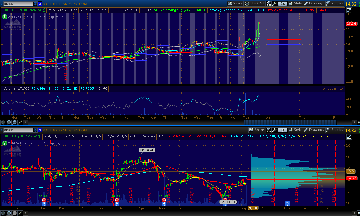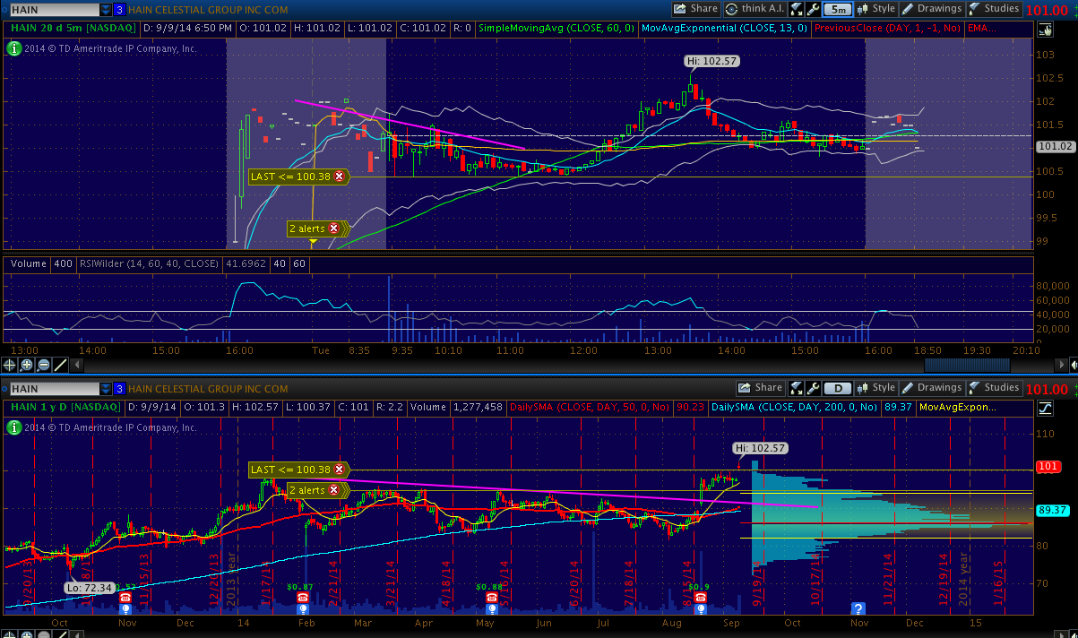 HAIN - here's another organic food stock in play because of this morning's deal that GIS is acquiring Annie's (BNNY). It's already up over 20% from last month and this gap seems lethargic. I see potential for today's intraday chart to set up a H&S pattern running into tomorrow.