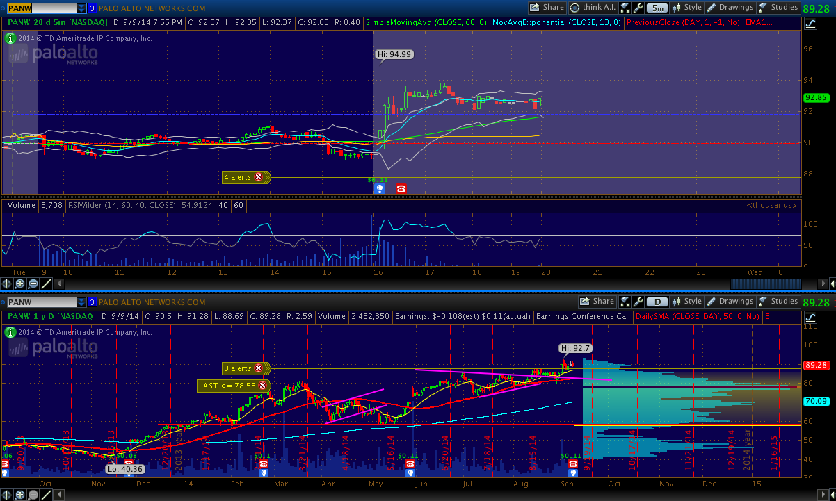 PANW - earnings were after the bell today. Issued in-line EPS guidance of $0.12 and a slightly better revenue forecast for Q1 ($178-182 mln vs. $173.43). Given the recent runup of this stock, good chance of a pop and fade like WDAY when it reported several weeks ago. Watching for lower high.