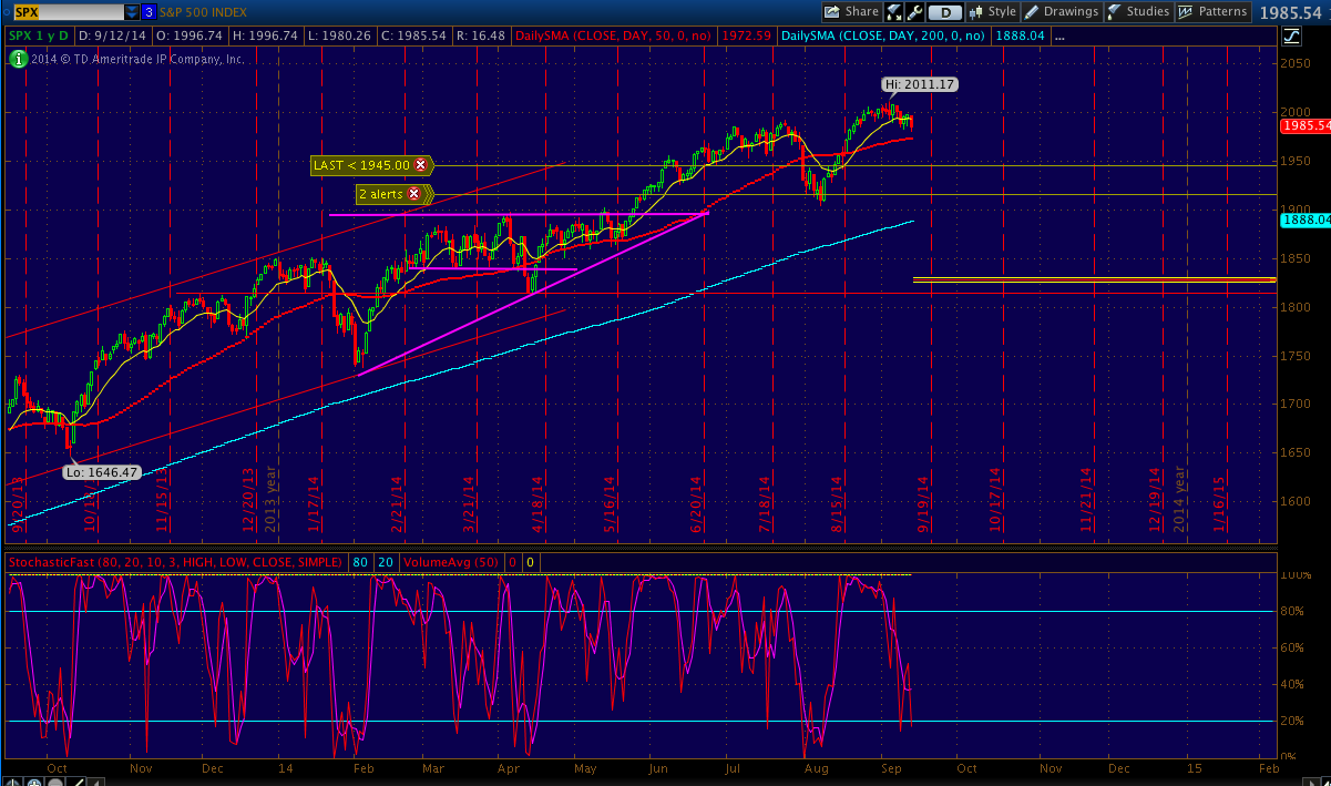 I expect this week to be choppy because we have a Fed meeting and anticipation ahead of the Alibaba IPO may cause Chinese stocks to pause. While I don't know for certain how the market might react to the Fed's statements, I have the feeling that the SPX will stay rangebound in this area above the 50-day moving average. The market has probably baked in the possibility of a more hawkish Fed, so we probably won't have any major correction. But the market has been straight up since early August and it will need to stage for any meaningful advance. Being selective with your swing trades will be the key to profitability in a choppy market.