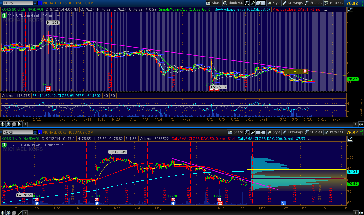 KORS (update) - Last week I suggested this one for a bounce. So far it's been a disappointment. I don't like how heavy it feels. Would rather wait for capitulation or some news to change the sentiment because this downtrend is just too strong.