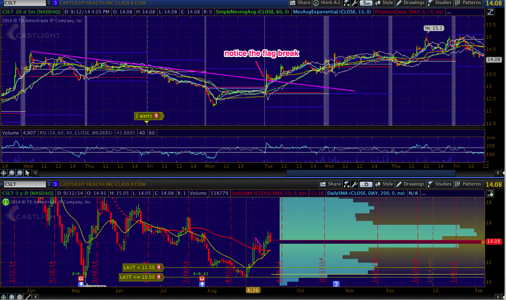 CSLT (update) - Last week I was watching this for a flag break. If you were quick on Tuesday you would have been able to pick it up for a nice 10%+ gain. I missed this one myself. But notice how for most of the morning the flag breakout area became support and then it began its ascent? I still think this has a long way to run but will wait for the next setup.