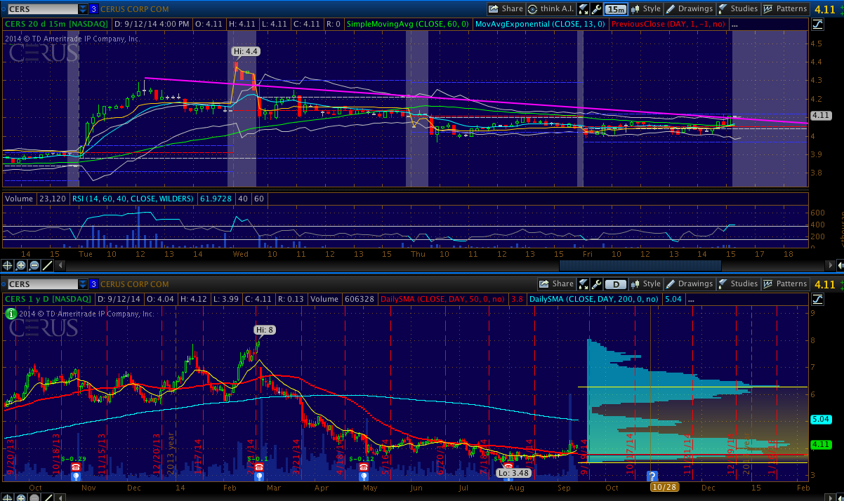 CERS - Bull flagging with volume expansion. Friday's close was very strong. This looks ready to break higher.