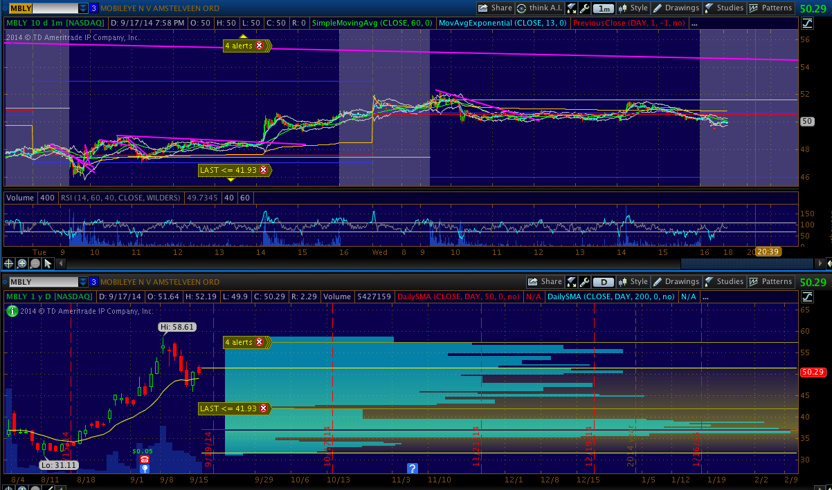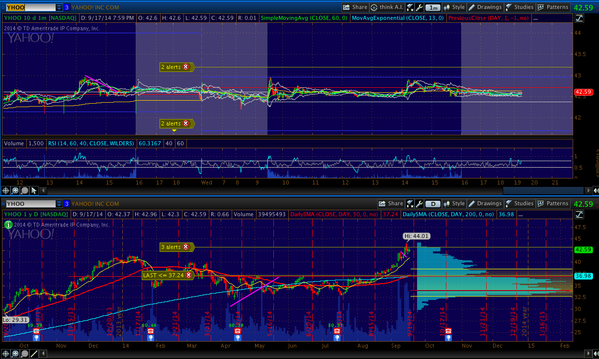 YHOO - When Alibaba starts trading tomorrow, I expect YHOO to fade as people who invested in YHOO for the Alibaba component dump YHOO shares and switch it out for BABA. Look for signs of topping in YHOO and go for the short. BABA is probably going to be a great IPO, but don't chase. If it starts trading at too high a value, it could fall. Better to wait for the long setup than be the first buyer.