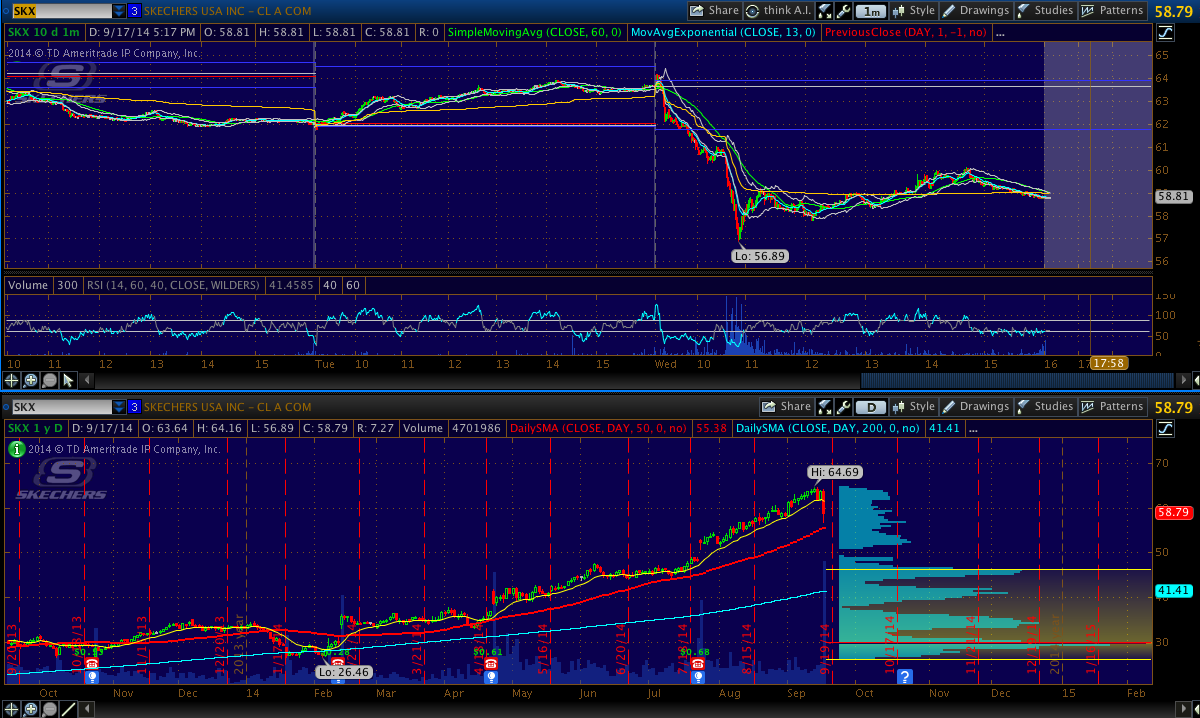 SKX - This thing took a hit today after announcement that they are initiating a copyright lawsuit against another company making similar shoes. This thing has had a big runup on the daily chart so I think a lot of this selling is not necessarily news driven but could be profit taking. Looking for r/g and higher lows for a climb back to 60.
