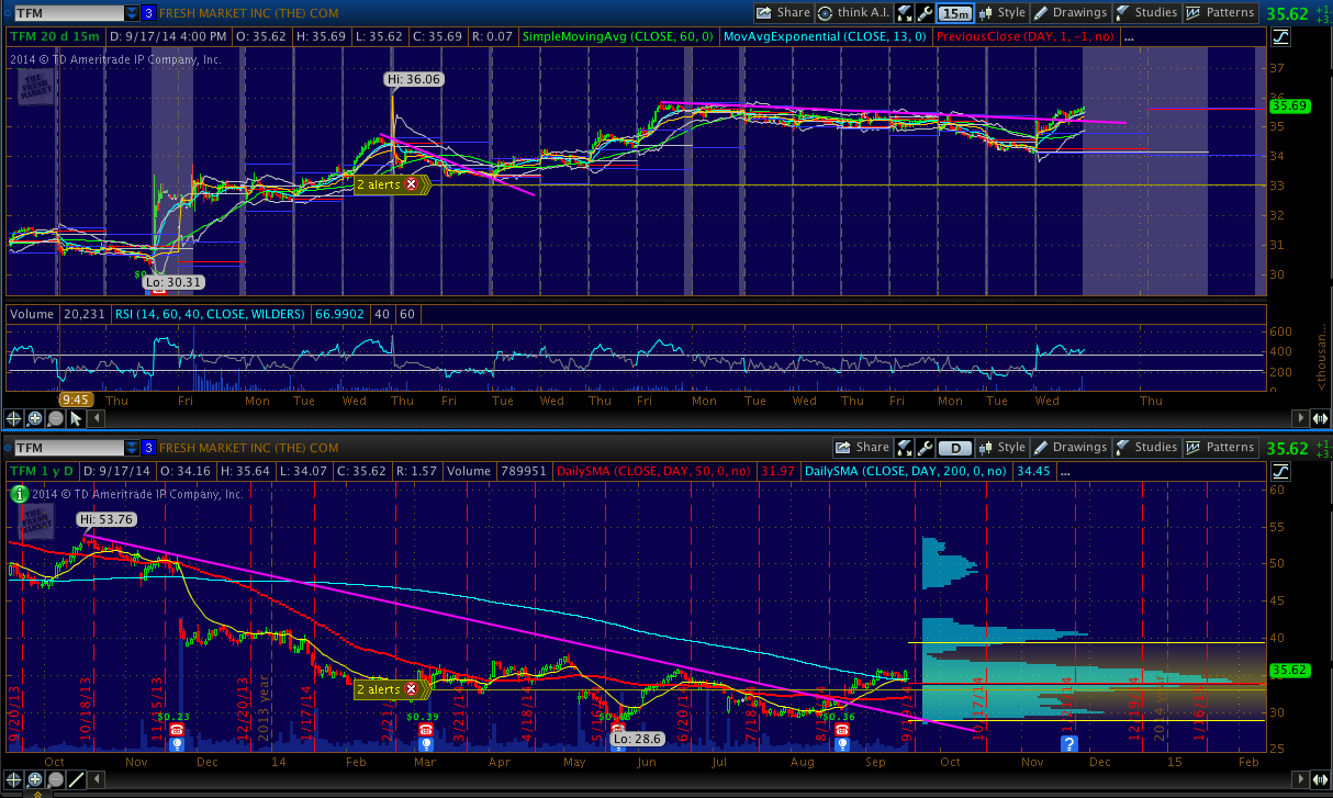 TFM - Breaking out of the flag on increased volume. Swing trade.