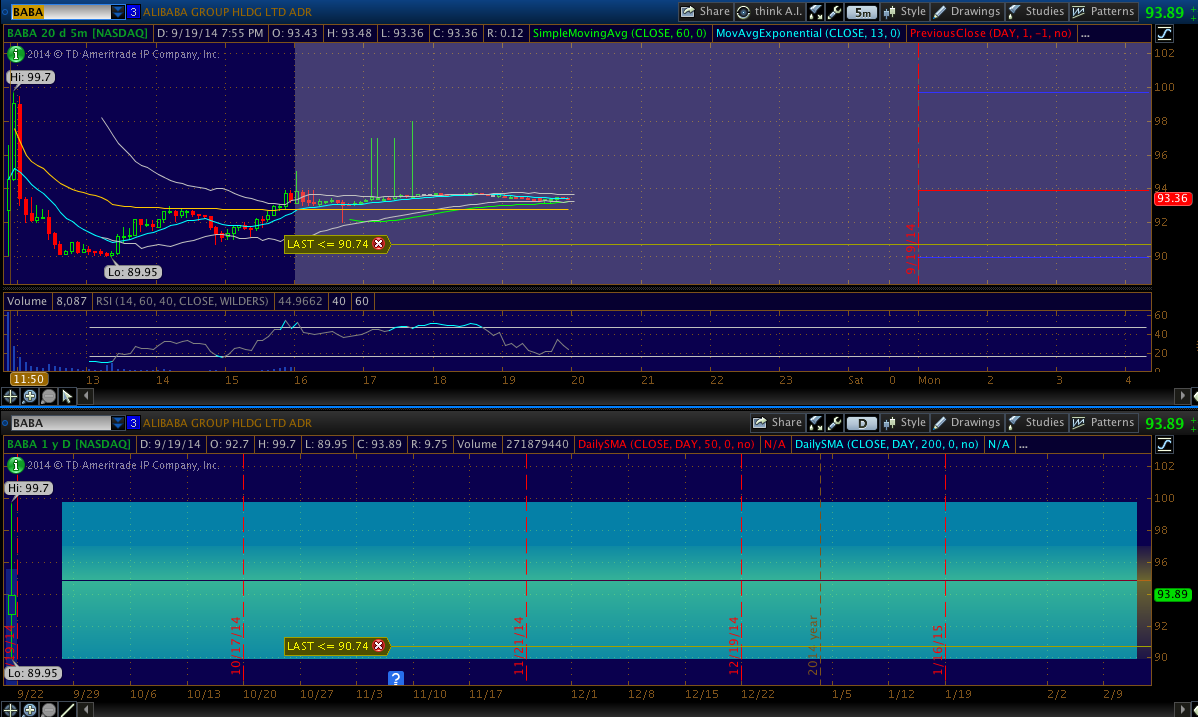 BABA - What an awesome IPO! Some analysts may be skeptical of the valuation here in the 90s, but I think the hype surrounding this will continue to drive the stock higher. As we've seen with a number of hot IPOs lately (GPRO, LOCO, RWLK), a strong first day often continues rallying into a second or third day. I think this could test 100 again after the people who read about this IPO over the weekend hit Monday with FOMO fever.