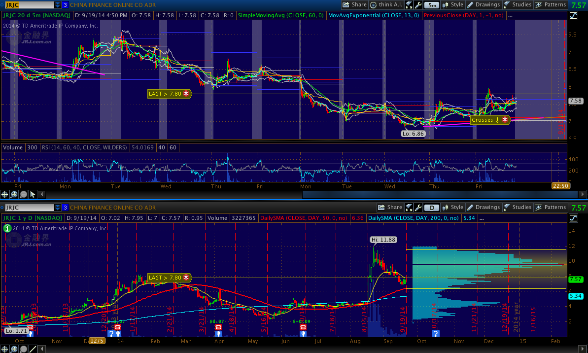 JRJC - I have the feeling this has one more big squeeze left in it. Watching that area between 7.80 and 8.00, which has acted as both a support and resistance.