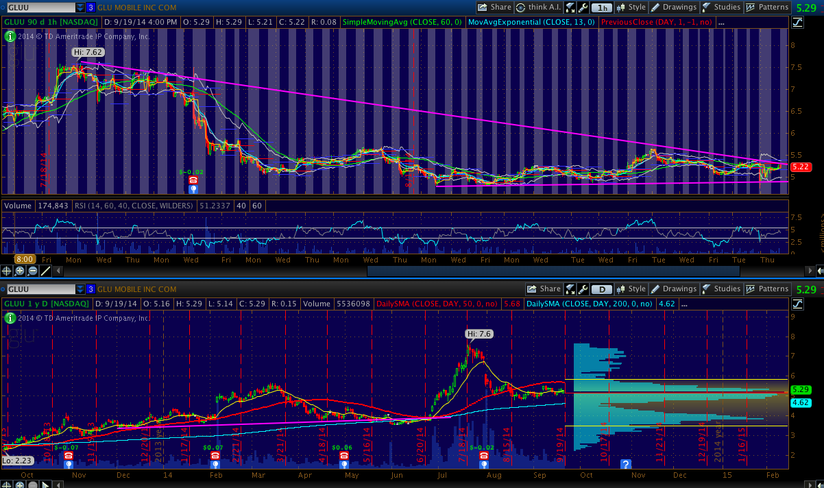 GLUU - Looks like its consolidating for a move higher. Good spot to accumulate with a risk on 4.75. Hard for me to tell though exactly on which number the breakout might occur. Might thrash around here for a few more days or weeks. Watch for any spikes in volume… that will be a leading indicator that a breakout is about to occur. This one is a bit risky though because I think its more like than other stocks to gap down on news. However, last Friday it dropped in the extended hours on news that they are raising another 10 million shares, and the dip was bought which is bullish price action.