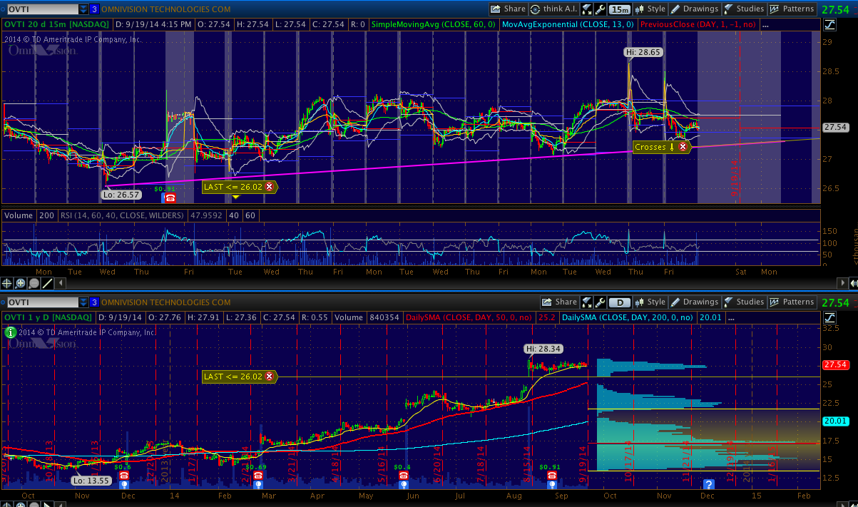OVTI - I know the trend on this one has been up, but look at how it's struggled to break the high made on the gap up day. I have the feeling that this one pulls back to fill the gap from 25, especially if we see some weakness in the Russell 2000 or Nasdaq Composite. At Friday's close, that's about 0.80 risk for over 2.60 reward.