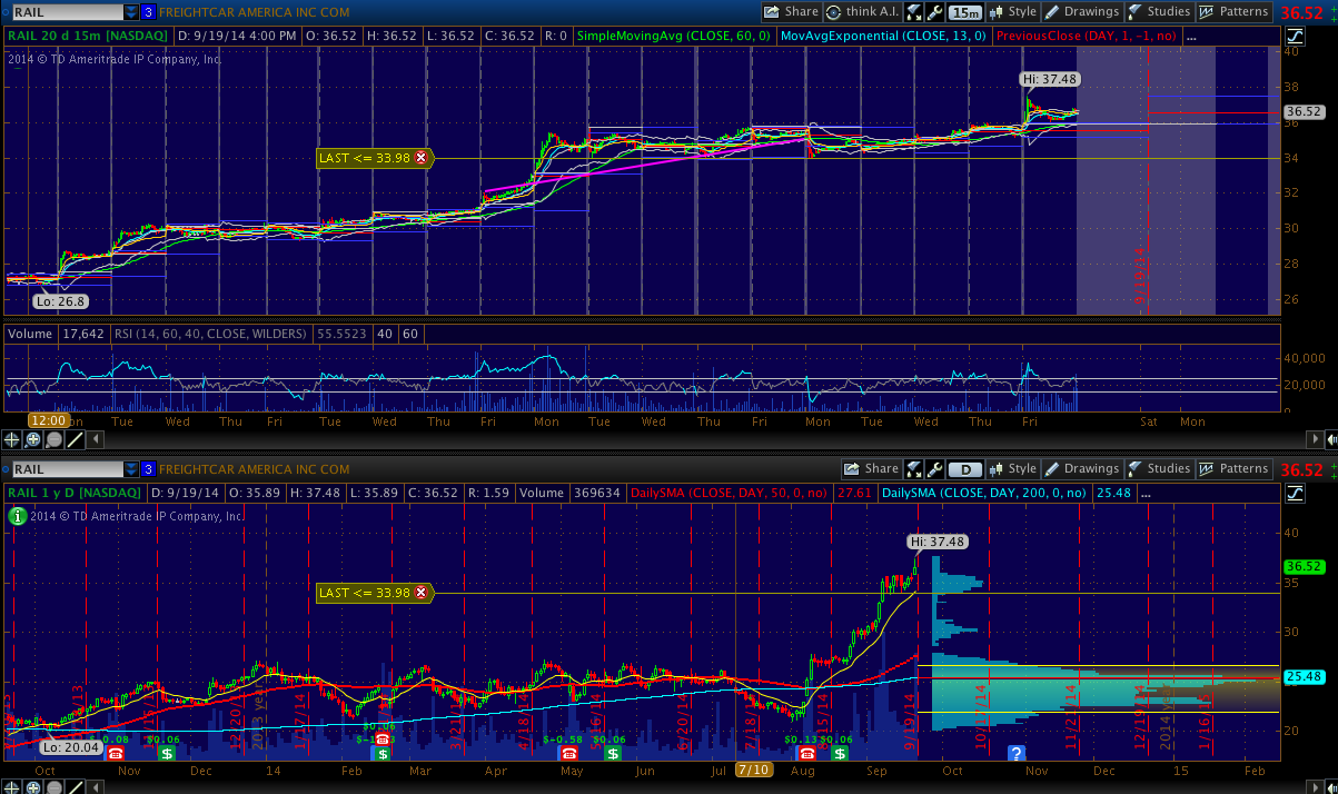 RAIL - This thing rallied following the analyst upgrades it got when it reported an earnings beat for the last quarter. But the shooting star candle may be a sign that the +63% run on this is reaching exhaustion. Looking for opportunities to short.