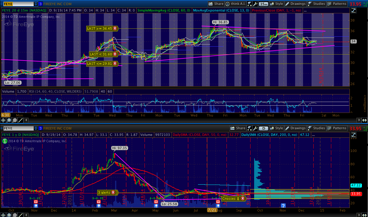 FEYE - Setting up for a bullish wedge formation. Tried to snag some shares on the Friday after dip but didn't get filled.