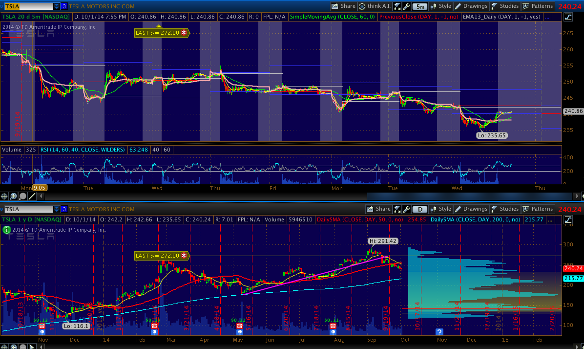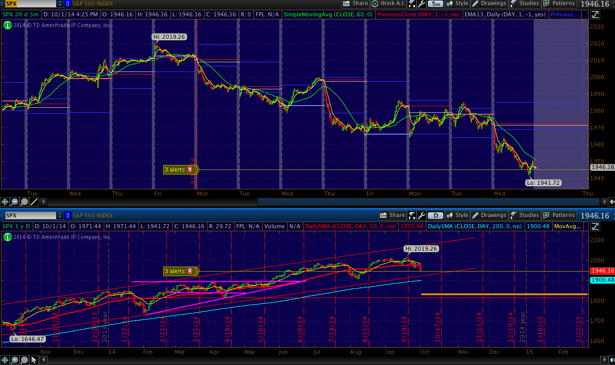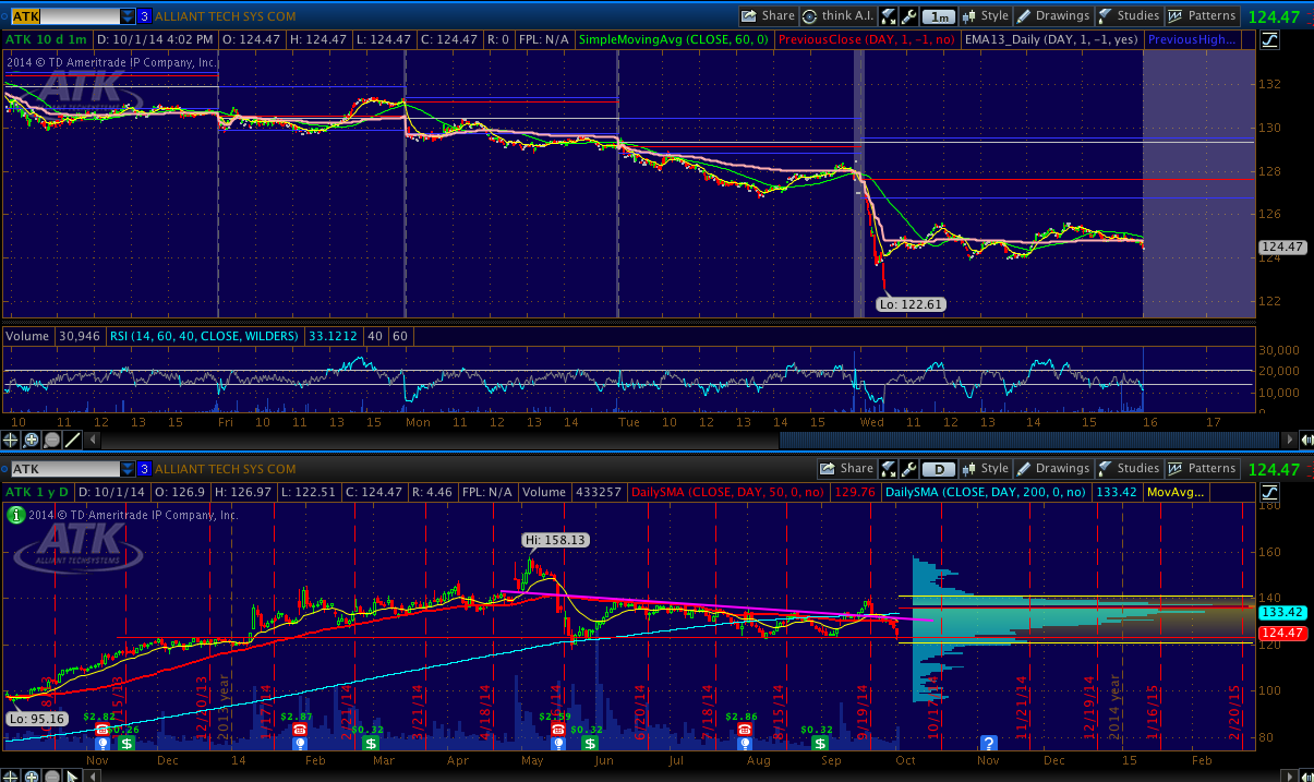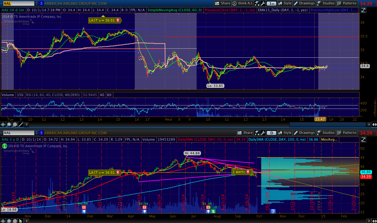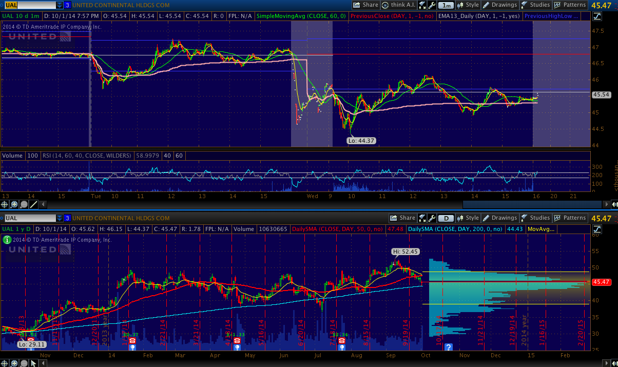 AAL/UAL - The airlines are hurt not just by the correction, but headline risk about Ebola and radar fires in Chicago. Watching these stocks because they will be back soon, but it's not time to pull the trigger just yet. AAL had a nice double bottom on the intraday chart - good example for studying intraday trades.