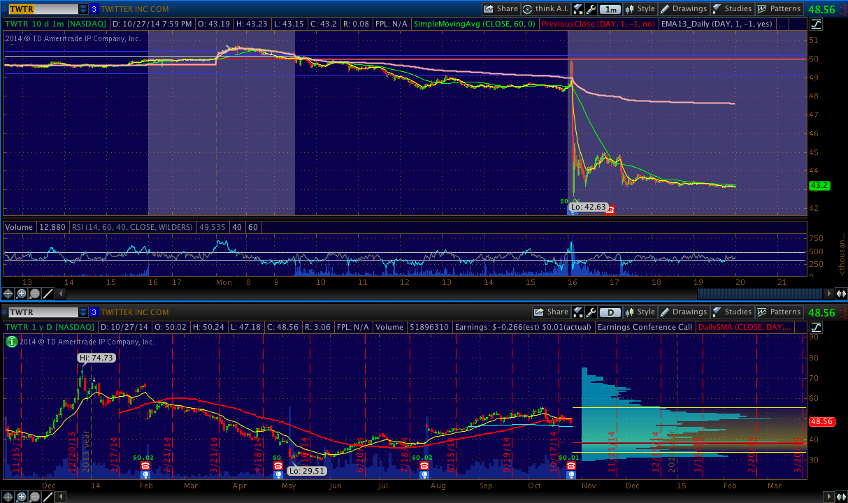 TWTR - Reported this evening with mostly in-line numbers. It may tank tomorrow, but may also find a bottom and bounce like YELP did last week. Looking for a move in either direction where I can bet with a set risk/reward.
