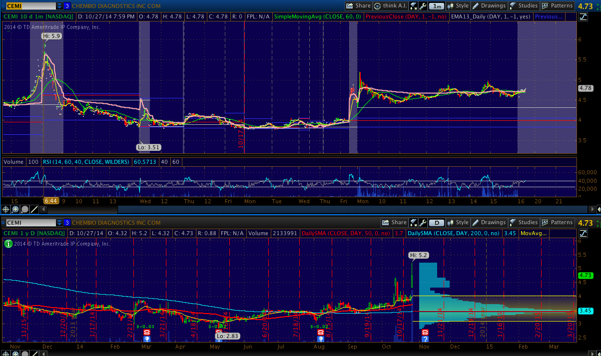 CEMI - This is the latest stock to run on Ebola news. The company came out with a vague press release announcing that they will develop a point-of-care Ebola test. I expect the momentum in this one to fade off and the gap to fill soon.