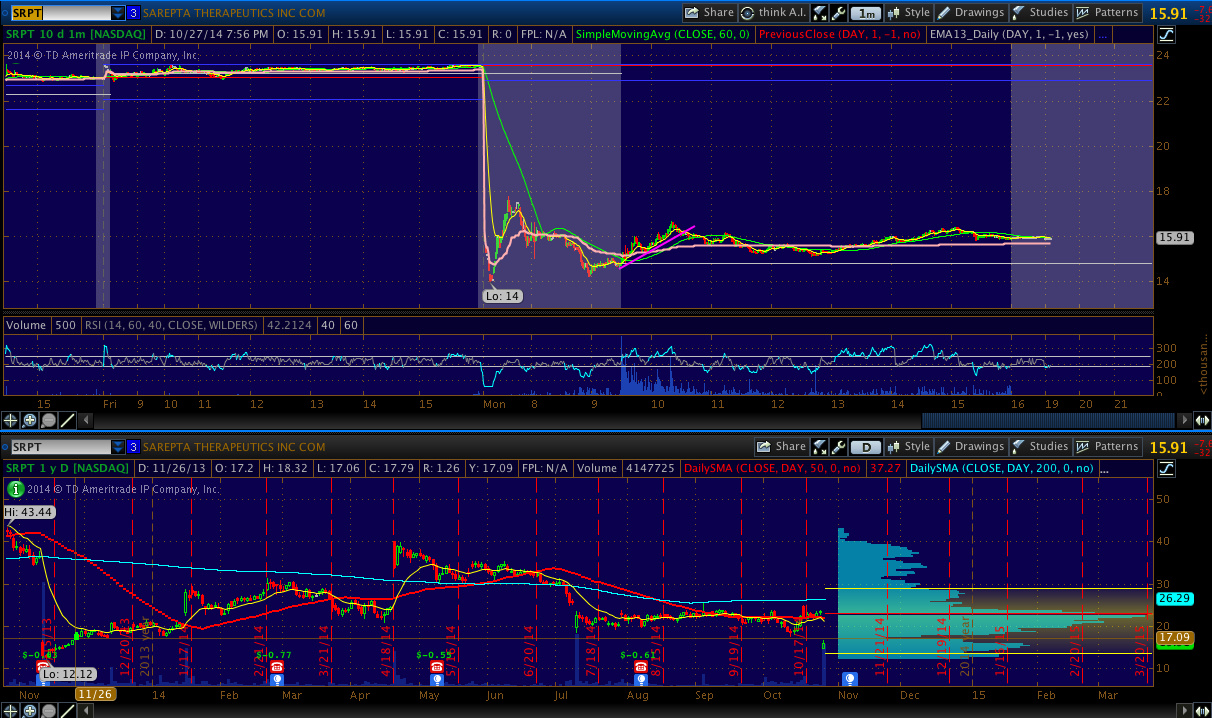 SRPT - Down big today on an FDA related delay on its muscular dystrophy drug. Looking for moves in either direction. Note that 17 is a big support/resistance level on multiple time frames.