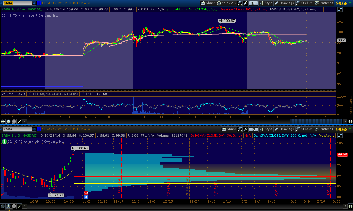 BABA - This thing has been straight up. Looking for it to top out around 100 for it to pull back. May take several days - kind of like GPRO.