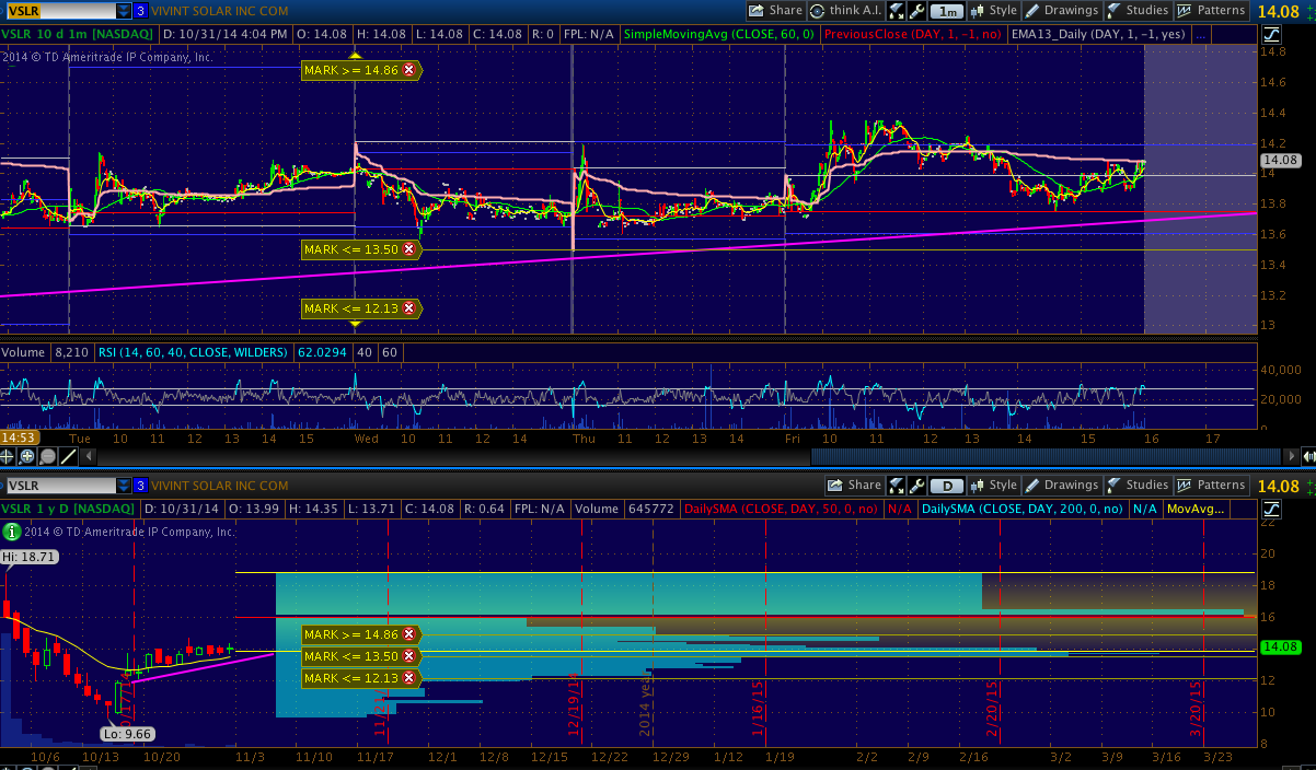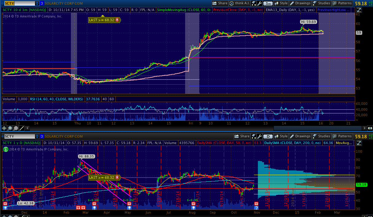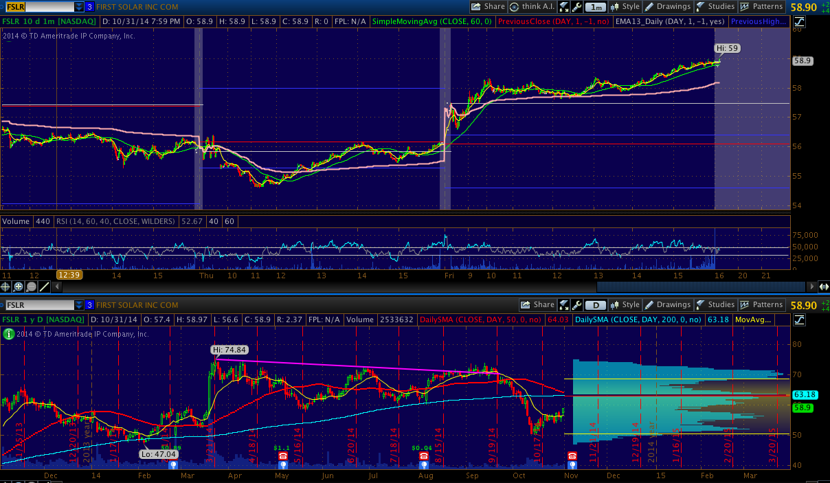 FSLR, SCTY, VSLR - Solars are starting to heat up again after being beat down with the rest of the market. SCTY and FSLR have earnings on Wed and Thurs respectively. I'm in VSLR for a swing trade, long biased.