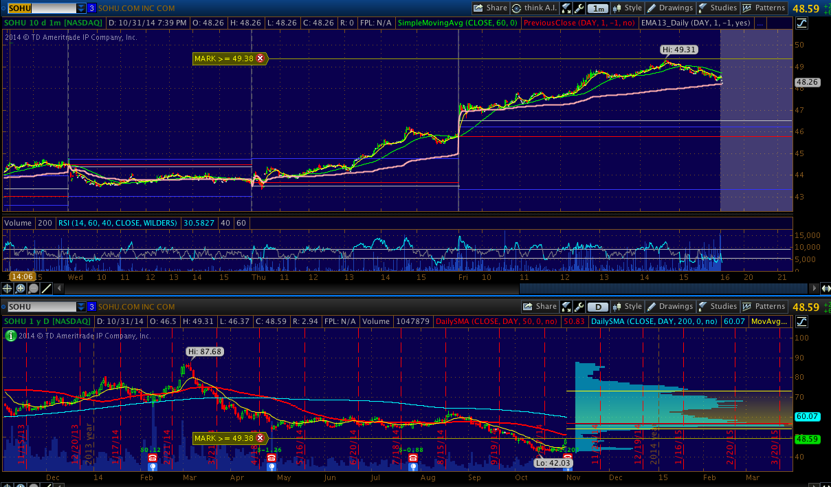 SOHU - e/r tomorrow morning. Given the base around the low 40s (42.5 is the absolute bottom) and high volume pop Friday, this may see continued momentum to the upside if the e/r is good.