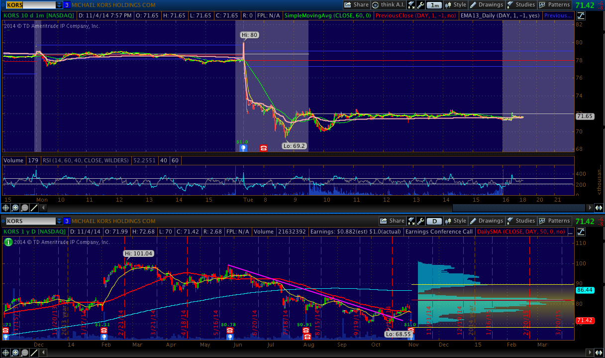 KORS - Another crappy quarter, but this thing has held above the 52 week low. The bottom may be in place, the sellers have run out of shares to sell. Looking to go long risking to 69.20 or 70.