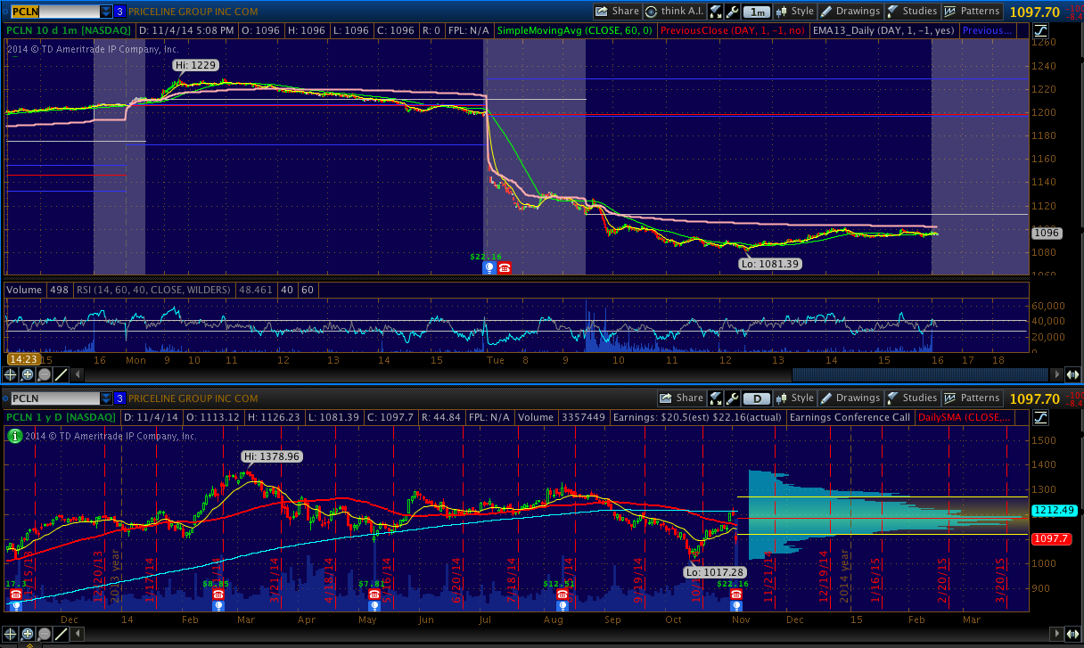 PCLN - I'm not sure what to think of the price action today. I have the feeling this will float lower given the 1100 level has been broken. Despite the earnings beat, guidance was to the downside. I'm short biased on the theory that growth fund managers may question whether the organic growth is slowing.