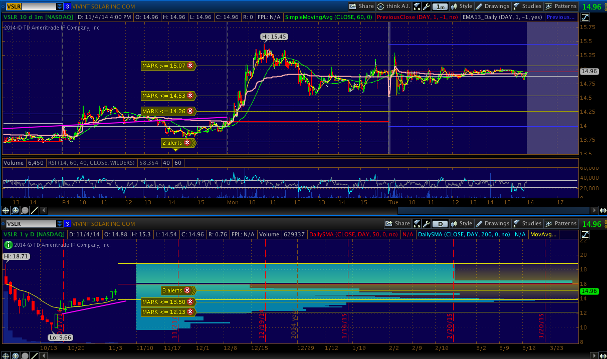 VSLR - I'm noticing a bullish divergence in this one vs. the other solars. While FSLR, SCTY, SUNE, CSIQ languished today, VSLR held steady. Looking at possibly breakout of 15 to 16.