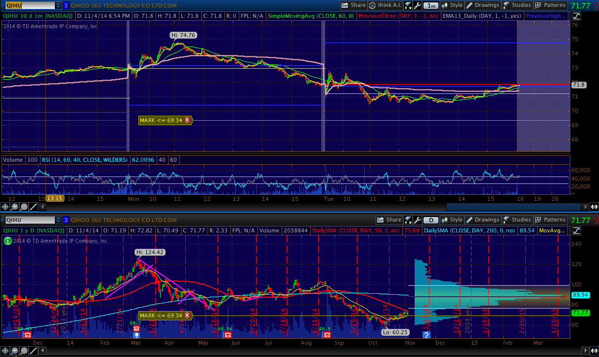 QIHU - One of the few swing trades that have my interest to the long side. Just waiting for a little pullback to go long.