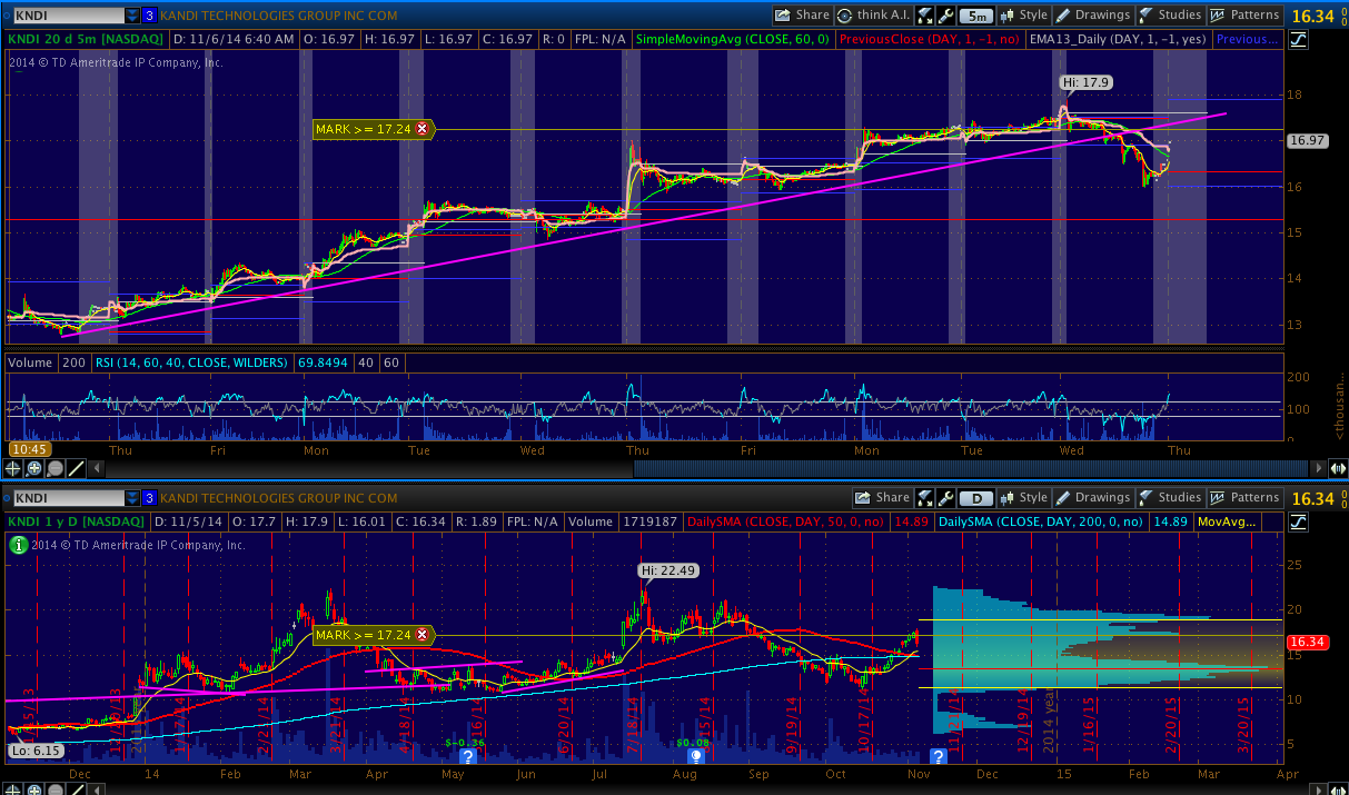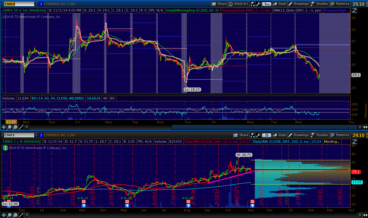 CMRX - like KNDI, breaking down the uptrend and testing that red line, the 50SMA. It has a horizontal support at around 28 which I'm looking to fall. It may hang in there until the earnings release tomorrow morning, then washout.