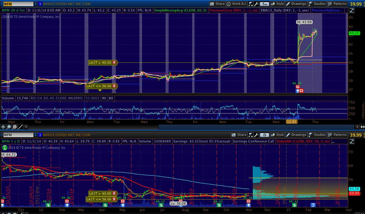 WFM - should be interesting, but I'm not too biased either way. Long consolidation here, they beat on earnings but the guidance was to the downside. We'll see if big money believes in the story again.