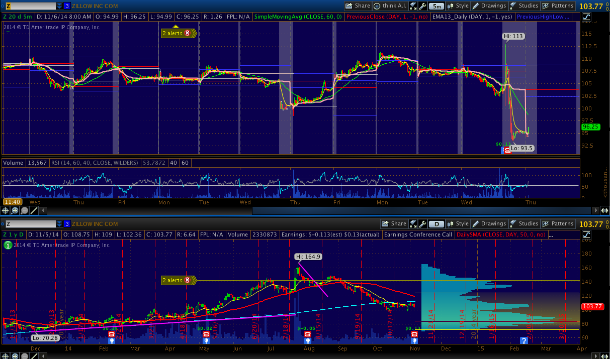 Z - mover on earnings. It went down after announcing guidance that was lower than expected. I think this could be like YELP/FEYE. Using 93.5 as a line in the sand for risk.