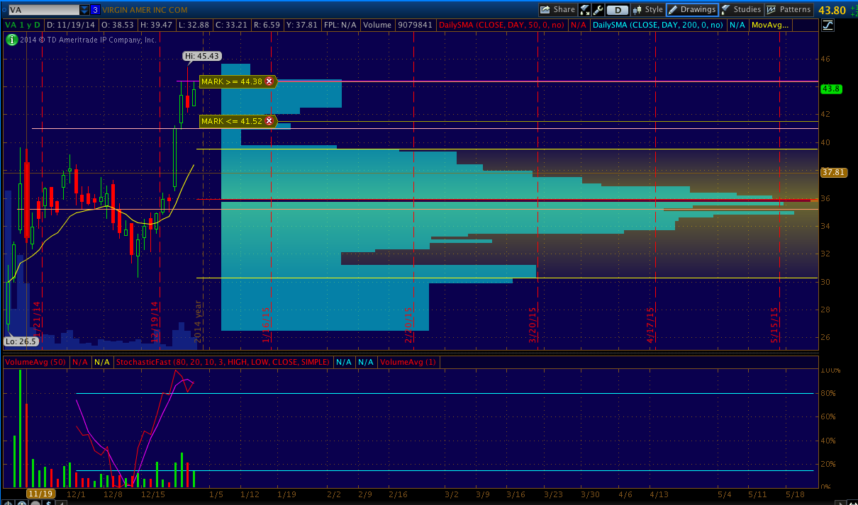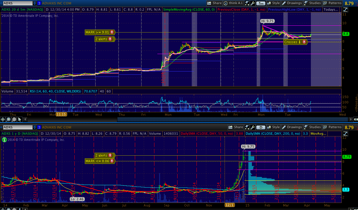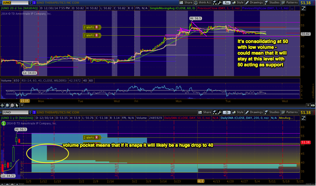 JUNO/ADAX - I had these on the watchlist from yesterday. JUNO seems to be consolidating above 50 so it could rip higher to 60. However, if 50 does break down it should be a pretty good breakdown. I anticipate it will be something like that big red candle day in VA 11/19. I'm short a little ADAX swing but will cover if it starts going thru 9 with any force. However, given its history of pop and fade I think it will have a pretty good breakdown - may have to wait until after the new year though.