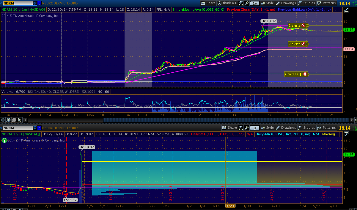 NDRM - The morning started off pretty well for me. I had a decent gain catching the bull flag at the open, but I took a beating in the afternoon trying to short this thing. Fortunately the damage wasn't horribly bad because I used small size and tight stops - but it still hurt. I last tried shorting this for a scratch in the after hours but 18 was holding up as support. May see the 20's tomorrow. This is just like CUBA - you don't think it can go higher and it squeezes everyone out. This is a trade driven by both euphoria for finding a winner in an otherwise stagnant market (longs) and fear from betting against it too early (shorts).