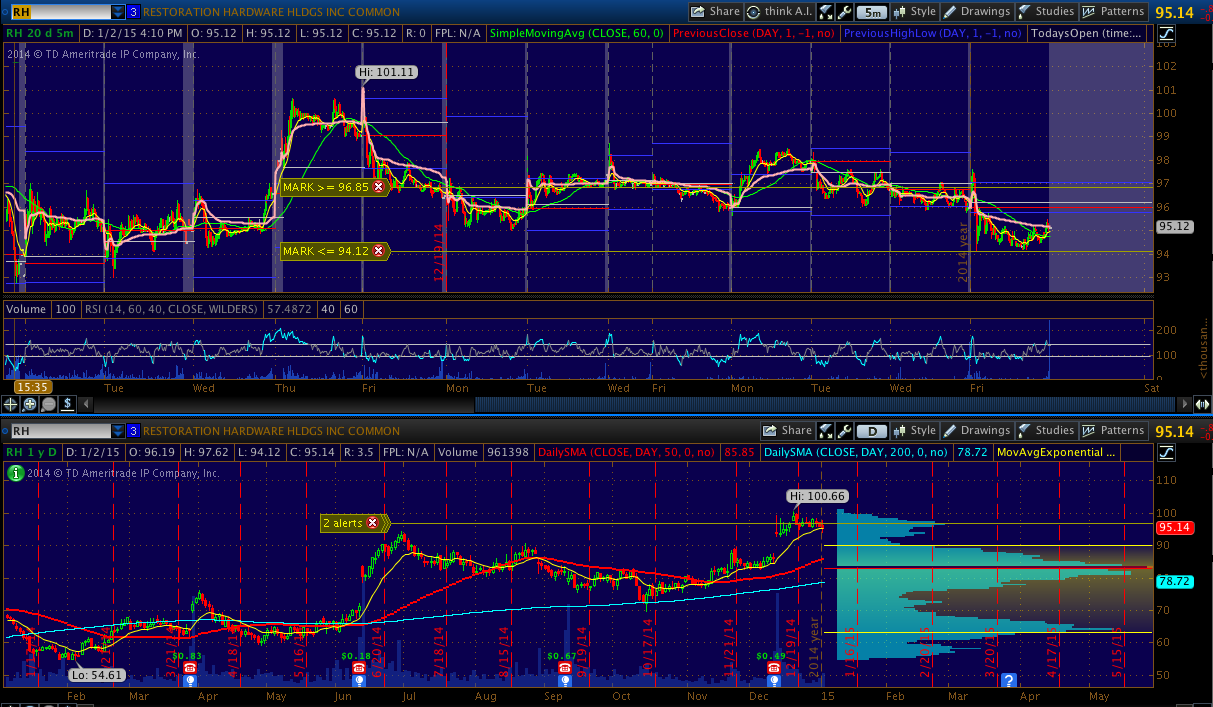 RH - Acting tired. Possible pullback to 90 if the market brings it down. Would consider shorting if it pops to 96 and begins fading off.