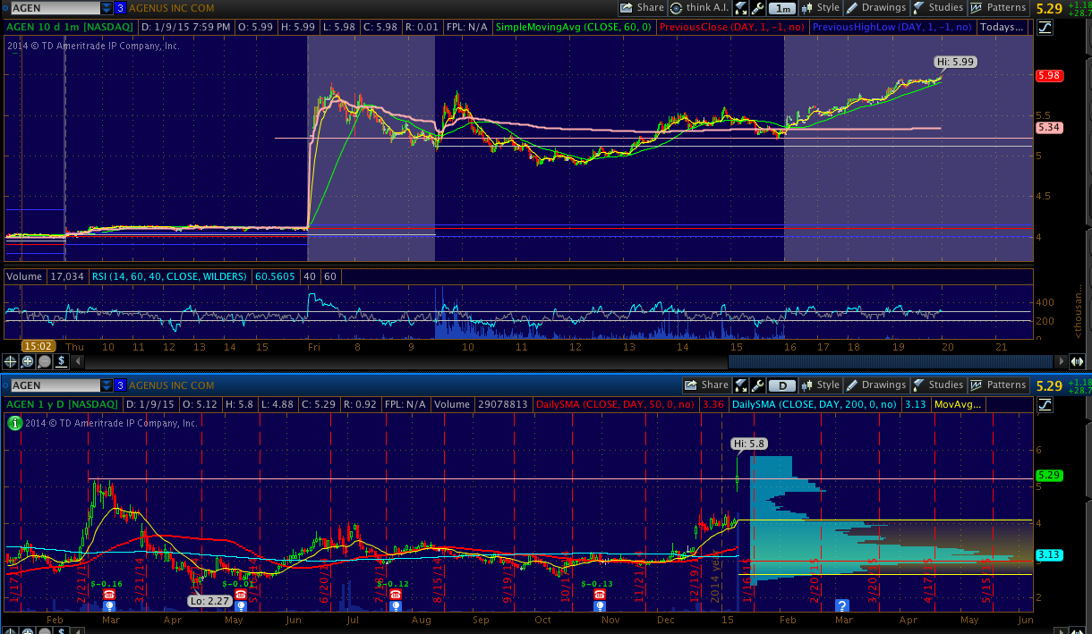 AGEN - In blue skies over a partnership with Incyte. Could be a breakaway gap. Looking for an ABCD setup to go long.
