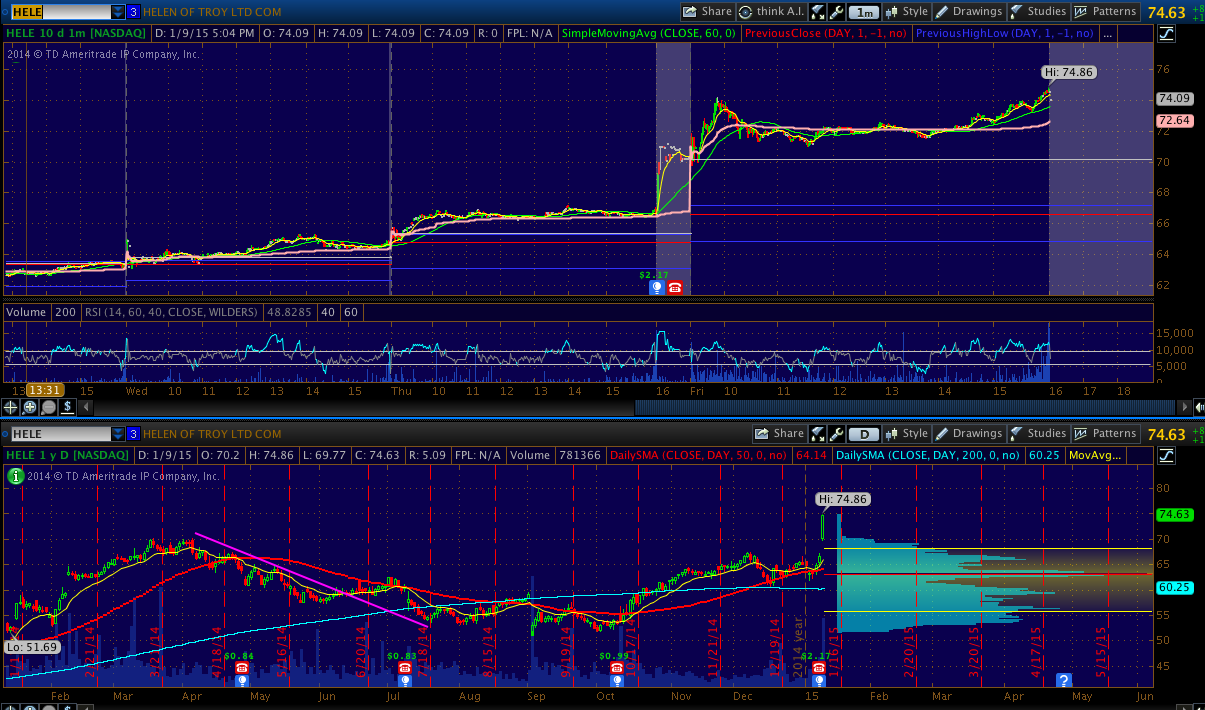 HELE - Possible breakaway gap here. Interested in possible ABCD or r/g for intraday tomorrow, but good chance it retests 70 at some point before running higher.