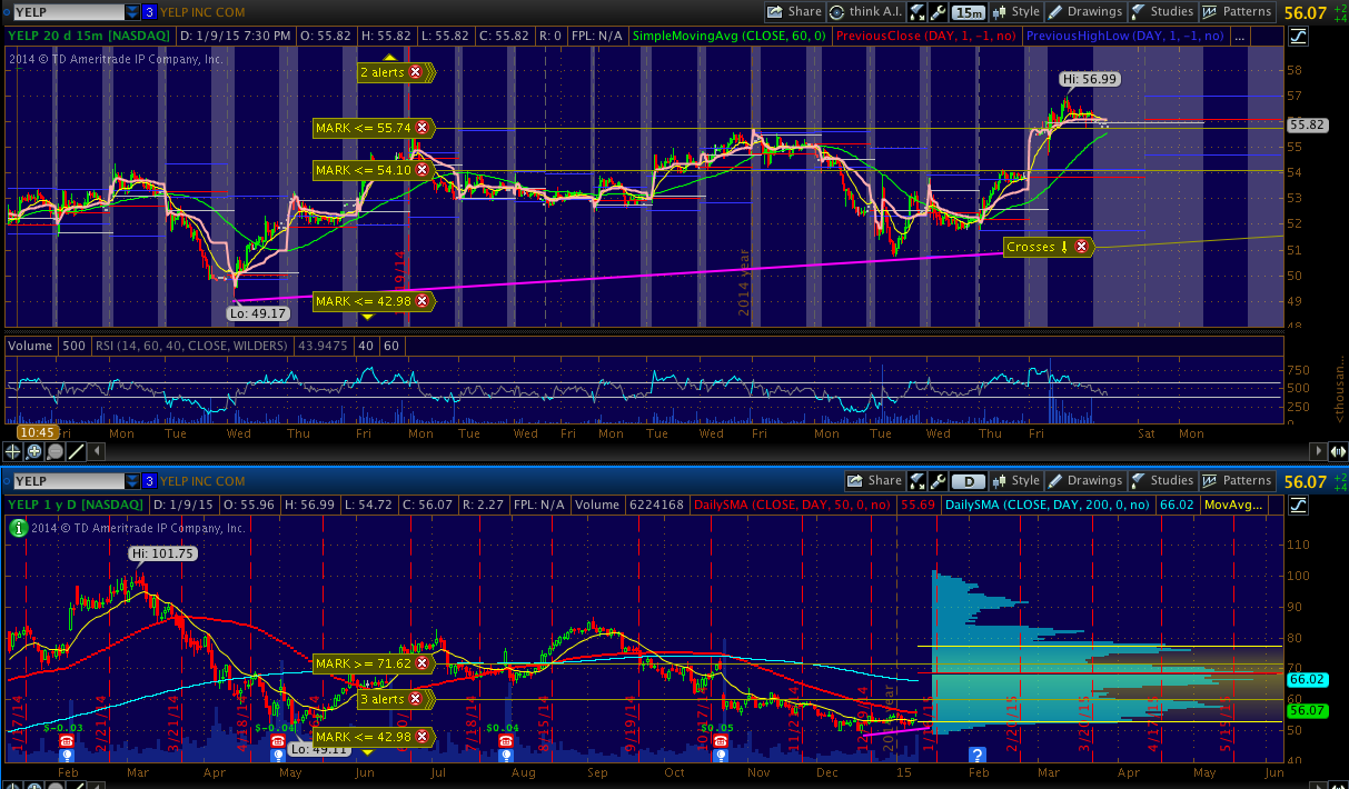 YELP - On Friday this had a nice pop above the recent highs. It's also made some higher lows this week. Would be interested in sizing into a position around 55.70, with a risk to the baseline.in the low 50's. Hard to tell where this will base to use as the next area of risk.