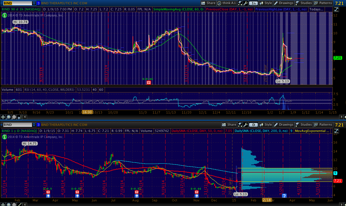 BIND - Very active since Thursday. I think this could grind up through 8. 7.50 is the current resistance area it has to overcome.