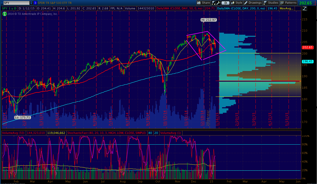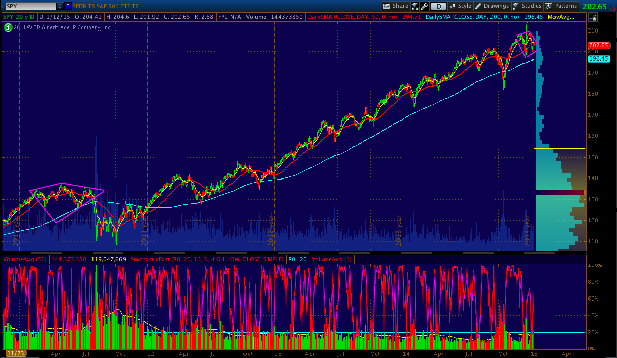 Looking at the technicals, here are charts of the SPY depicting the diamond top we are about to exit. I've also found that the last major correction we had in 2011 coincided with a very similar pattern of a higher high followed by an immediate higher low. Could an engineered crisis be in the works?