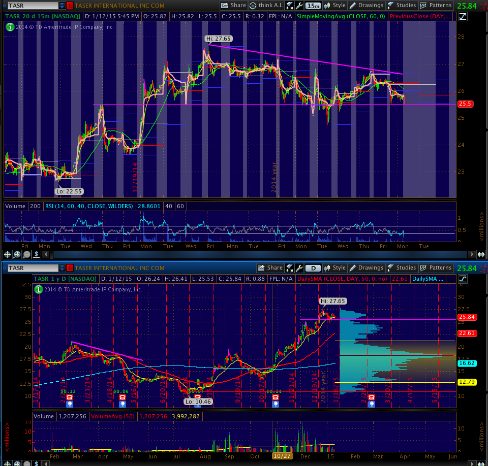 TASR - Looks like it set a lower high at 26.6. Watching closely how it behaves around 25.5. If 25.5 snaps and becomes resistance, could easily see 22's.
