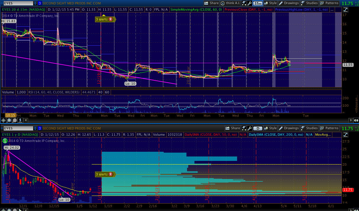 EYES - This was up on regulatory approval news in Canada. 11.80's been resistance and it looks like its retesting that area right now. This is one of the few longs that I like right now and would be willing to take any intraday pattern of dips/higher lows, or swing trade it using the 1/12 LOD as a risk. It's got a volume pocket just above at 12.50 so should be smooth sailing to 13.50, maybe to 15.