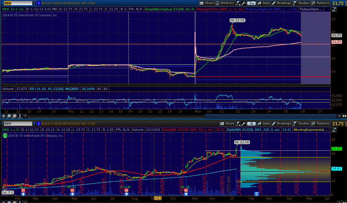 BBW - Coming off of a a breakout to 52's and nice consolidation, long biased if 21.25 holds as support. Could be good for swing trade.