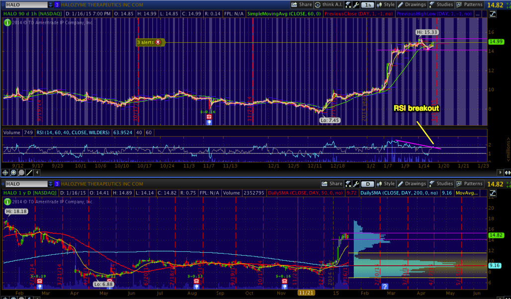 HALO - On Friday I tried anticipating a breakdown of the support around the 14 area and quick snap, but it held and grinded up. I think this is acting very bullish and I'm looking closely for a bull flag formation or break through the highs at 15.33.