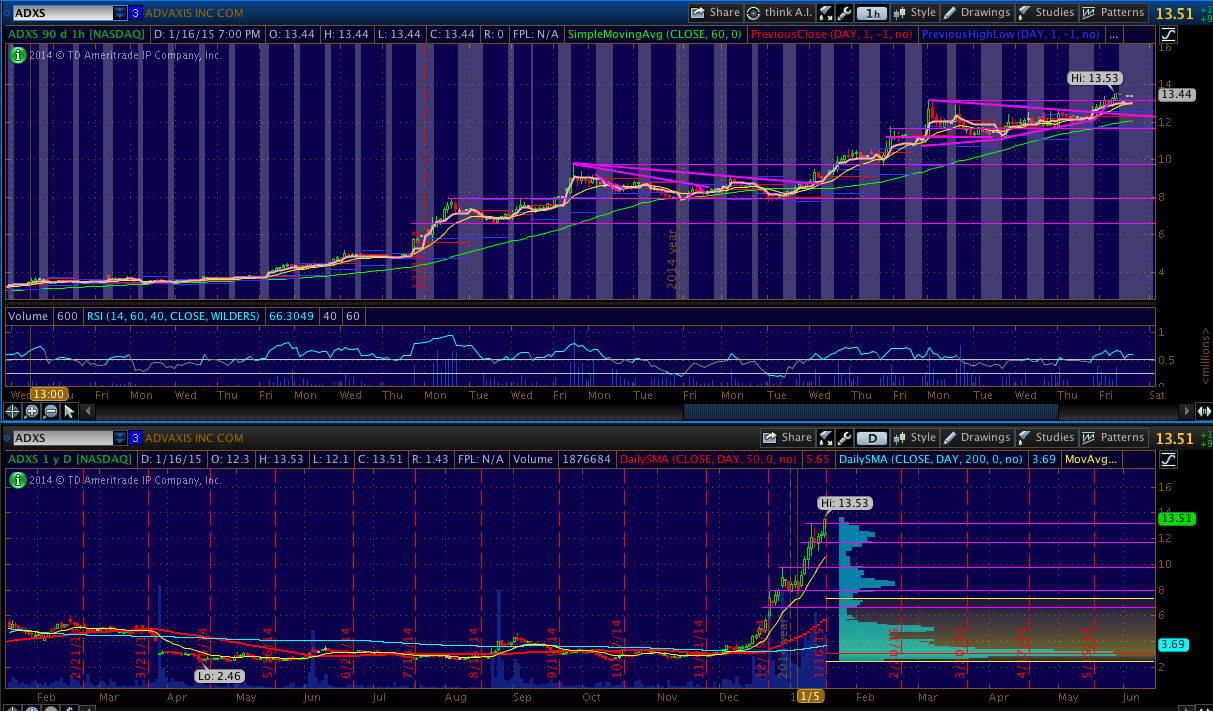 ADXS - Squeezing higher, I think 14-16 is possible. Want to see it retest the previous high of 13.17 and then start grinding up.