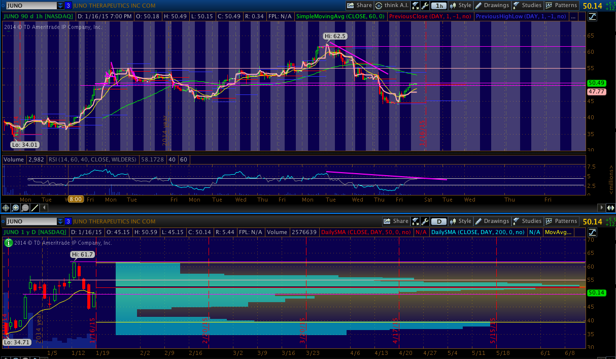 JUNO - This one has a lot of bag holders above now, and seems to be testing that critical area of 51. Watching for that level to act as resistance and for this to retreat back to 45, possibly lower.