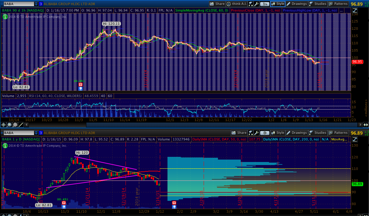BABA - Seems to be running a similar course to MBLY. Letting it come back up to test the resistance at 100 and then short for a 92 target.
