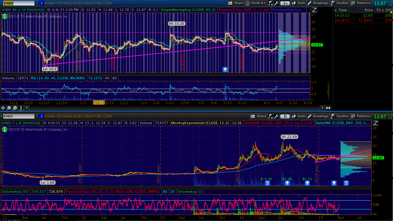 KNDI - 10 has been a solid support going back to the very beginning of 2014. There seems to be some recent support at 12 on the shorter time frames. A move to the 200DMA near 15 seems well within reach.