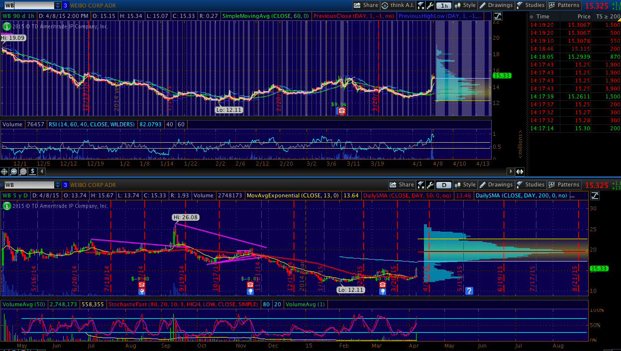 WB - This thing is beat, but its got a nice series of higher lows since it got near 12 at the beginning of February. With only a 13M share float, it could take off substantially if money flows in.