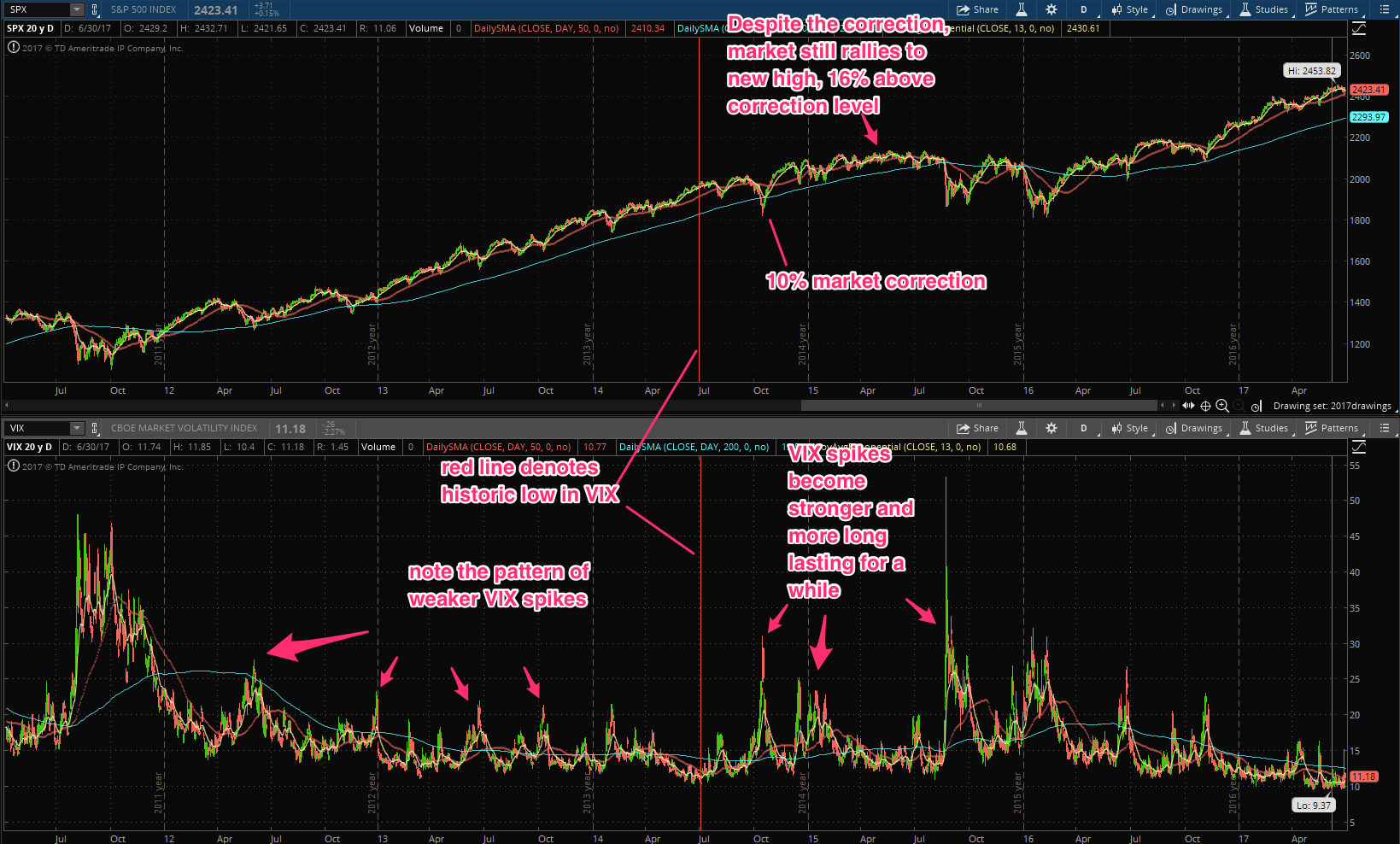 - The complacency signaled by the VIX may signal a correction of 7-12% occuring sometime later this year, but the bull market can resume shortly after.