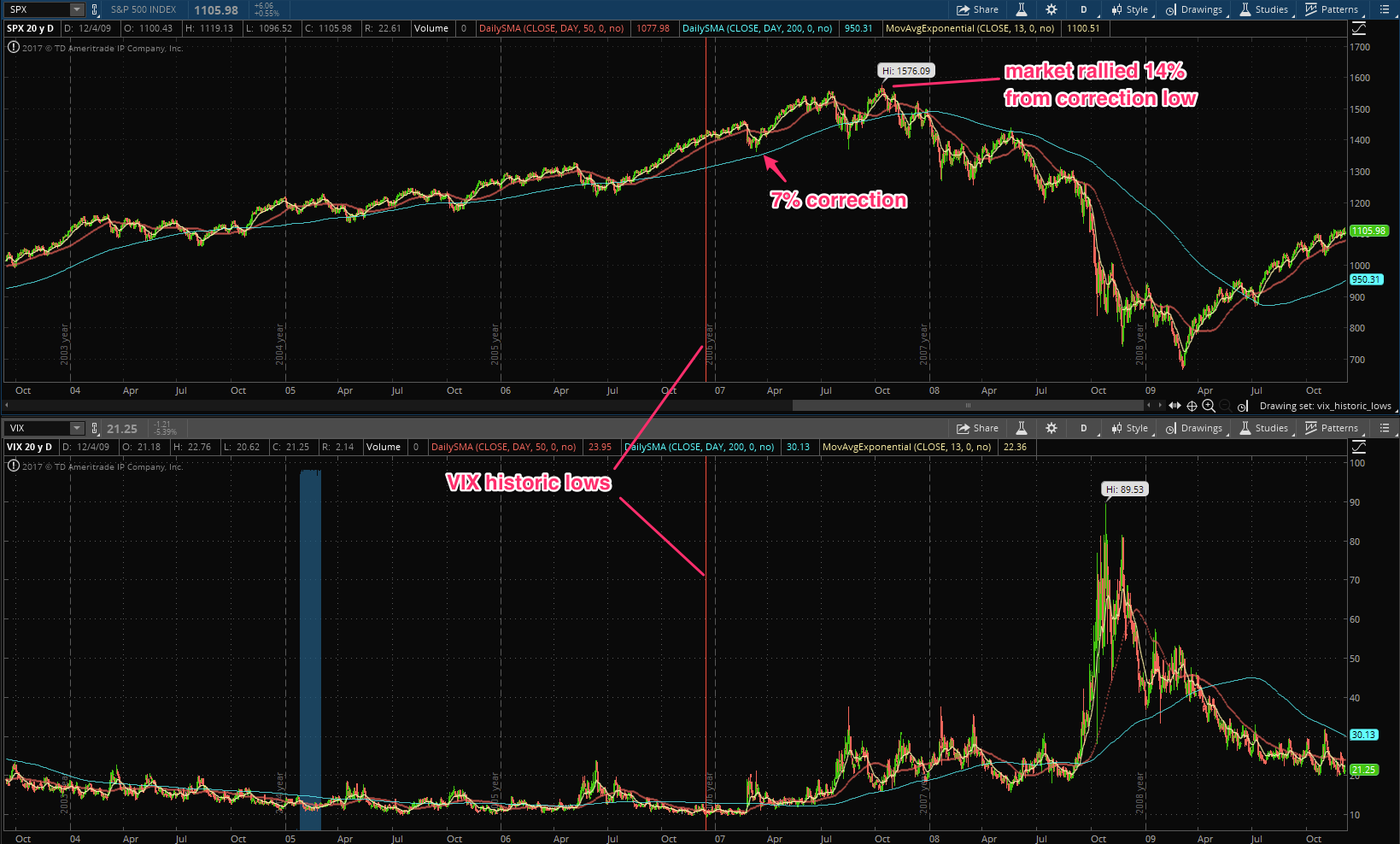 The time before that the VIX hit a historic low in the fall of 2006. Similar story… a correction followed not long after.