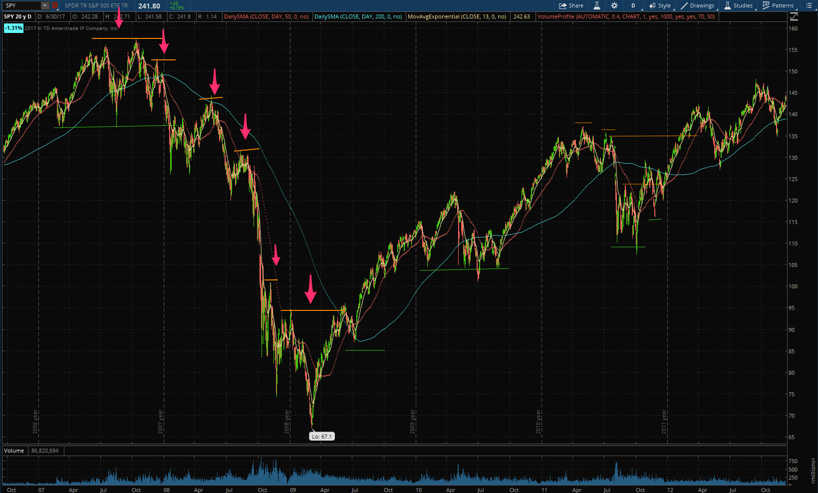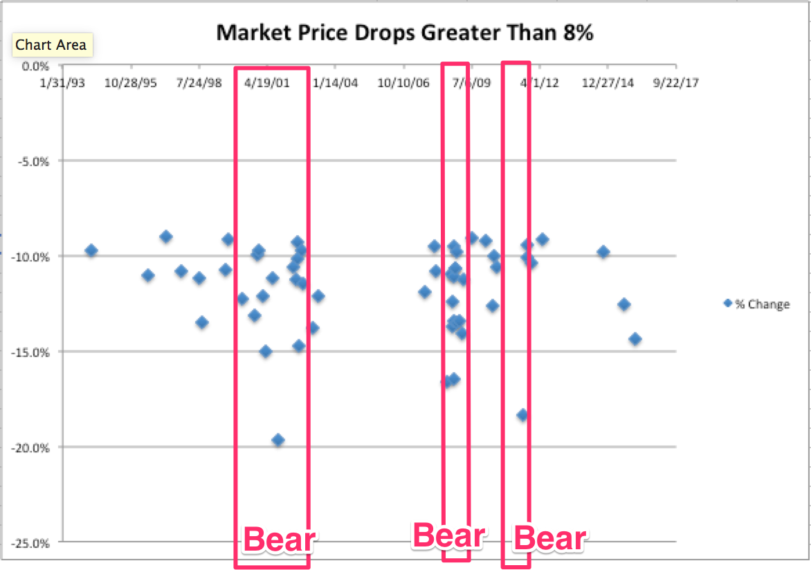 Previous Bear Markets last on average 60 weeks from peak to bottom, giving you plenty of time to get out early. The following chart shows that entering a bear market you have many large price fluctuations exceeding 8%. The market rarely drops 20% out of the blue without prior warning signs.